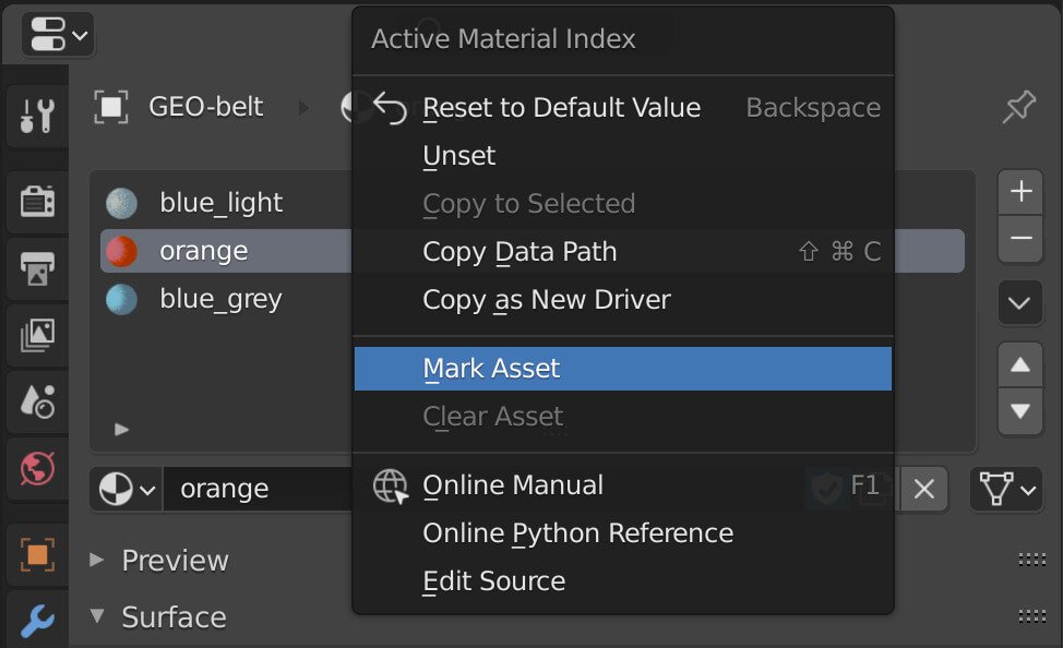 Una volta aggiunto l’elemento negli assets, semplicemente tasto destro sull’elemento e poi Mark Asset, lo potremo aggiungere facilmente nei nostri progetti